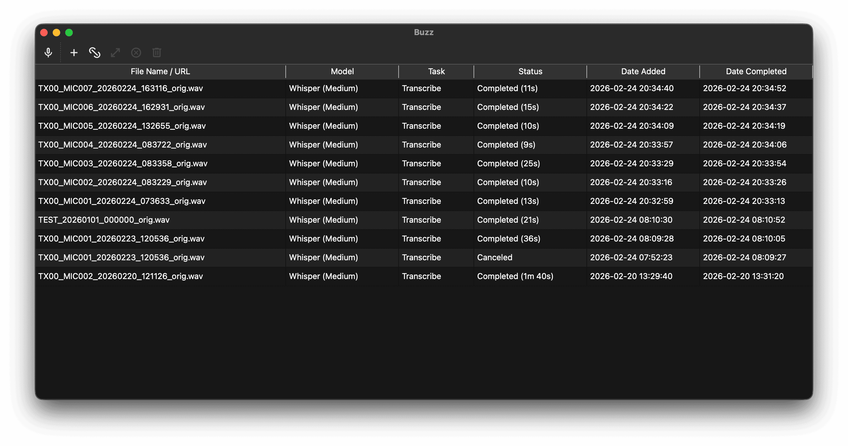 最开始的 bug 很典型:Buzz 的命令行接口在新版本里把子命令藏起来了。我的代码直接调 Buzz --task transcribe ...,结果它每次都悄悄打开 GUI 等待用户操作,两分钟超时,然后 fallback 到 whisper。程序没报错,但其实从来没有真正用过 Buzz。