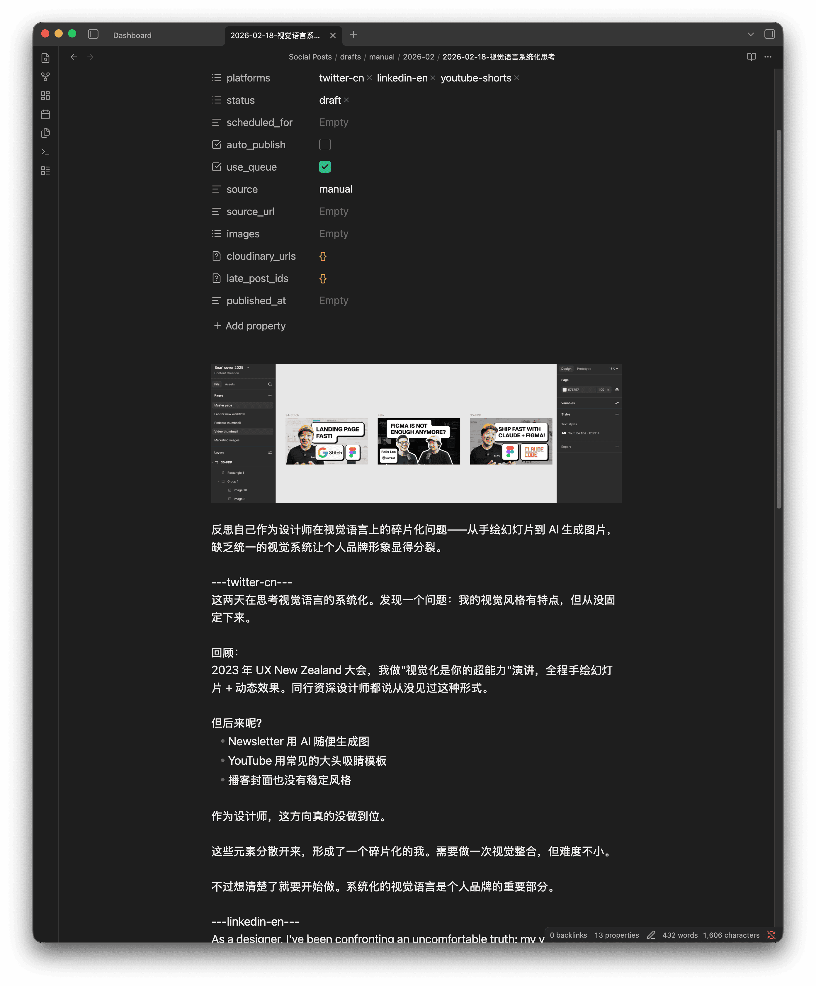 第三阶段:笔记变帖子。 我在笔记里打 #Share 标签的条目,会被提取出来,然后再调用一次 Claude,同时生成三个版本:推特中文长文、LinkedIn 英文、YouTube Shorts 标题加 hashtag。每条帖子单独存成一个 Markdown 文件,进我的内容库。
