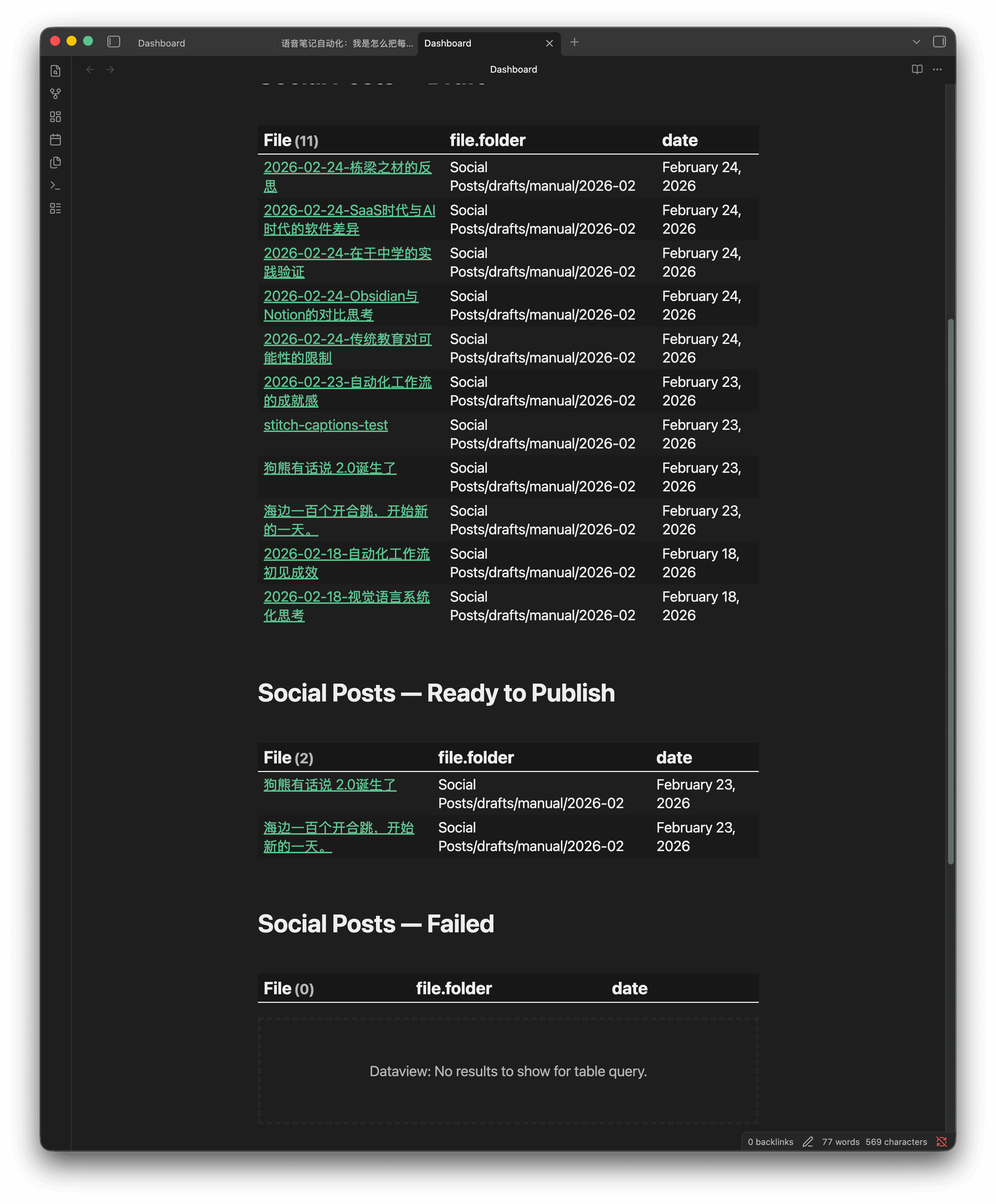 录音笔 SD 卡里的文件拷进来,跑一个脚本,然后我就能在 Obsidian 里看到当天整理好的笔记。如果有些内容值得发布,打个 #Share 标签,再跑一个命令,三个平台(推特、LinkedIn、YouTube)各自准备好的内容就全存到内容库里。