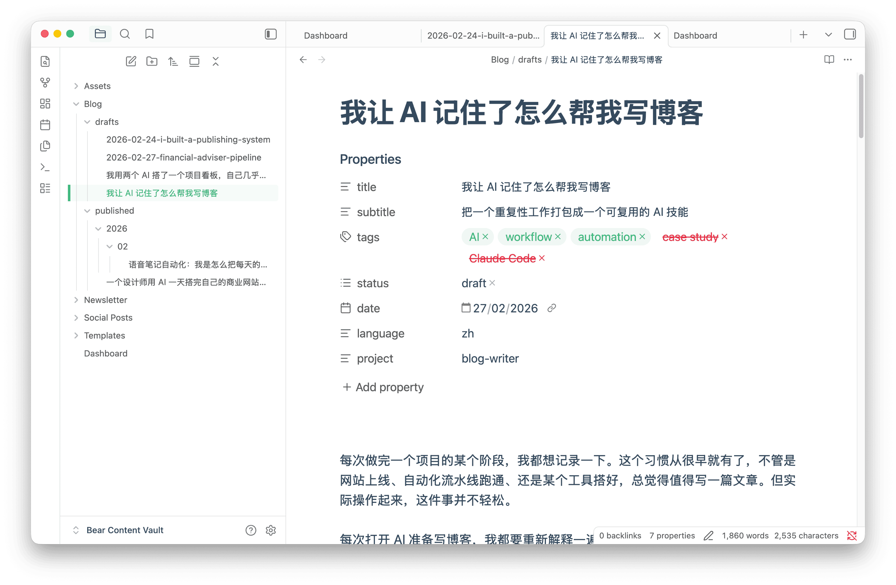 第三个问题是文章存在哪里、按什么格式。这个相对简单,但也是每次最容易出错的地方。我的博客草稿统一存在 Obsidian 的 Bear Content Vault/Blog/drafts/ 目录下,frontmatter 需要包含标题、标签、状态、日期、语言、所属项目。这些东西如果每次靠我自己填,总会有漏掉的时候。